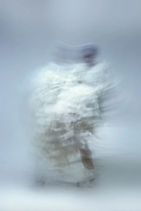 A striking black-and-white photograph blending minimalist architecture, generational movement, and choreographed visual storytelling.